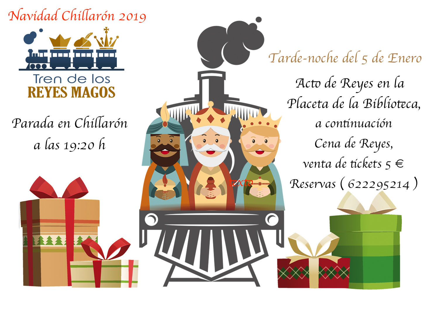 Acto de Reyes el 5 de enero de 2020. Llegada de los Reyes Magos a Chillarón de Cuenca en tren, entrega de regalos y cena popular.