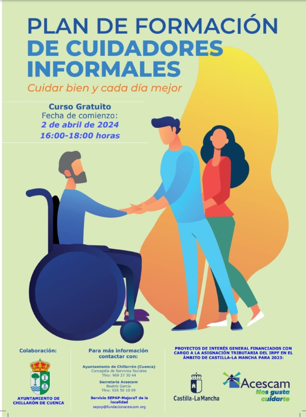El Ayuntamiento de Chillarón de Cuenca se suma a este programa de formación de cuidadores informales. El curso impartido será gratuito. Dando comienzo el de abril de 2024 de 16:00 a 18:00 horas en nuestra localidad.