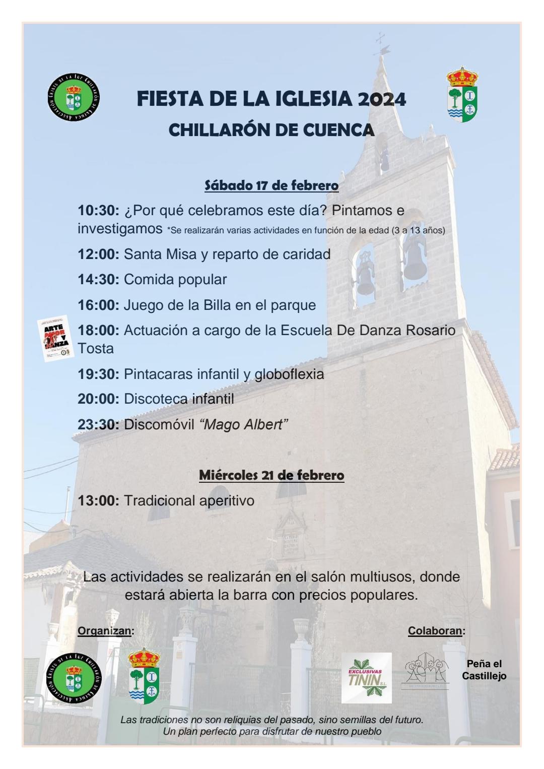 Fiesta de la Iglesia en Chillarón de Cuenca. Chillarón ha celebrado la Fiesta de la Iglesia, con una gran variedad de actividades, donde la afluencia y la participación ha sido muy alta. El 21 de febrero, fiesta local en Chillarón, se ofrecerá un aperitivo tradicional.