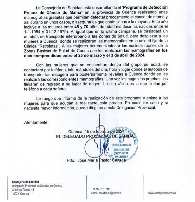 La Consejería de Sanidad esta desarrollando el «Programa de Detección Precoz de Cáncer de Mama» en la Provincia de Cuenca. Este programa realiza mamografías gratuitas con las que poder detectar precozmente el cáncer de mama o asegurar que todo está bien.