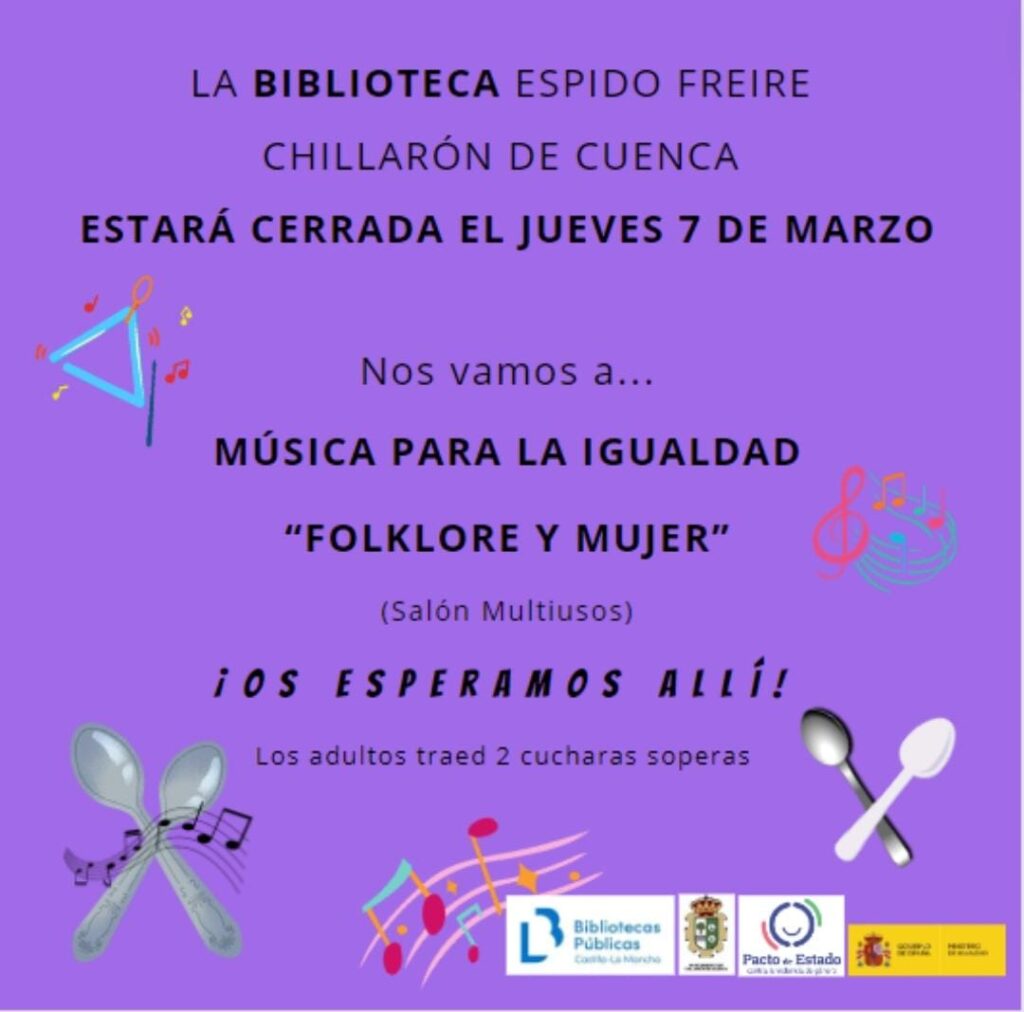 La biblioteca Espido Freire de Chillarón de Cuenca estará cerrada a partir de las 20:00 horas el jueves 14 de marzo. Los talleres de animación a la lectura serán en su horario habitual. Los Deditos Lectores a la 17:00 horas, los Dragones Lectores a las 18:00 horas y los Sin Nombre a las 19:00 horas.