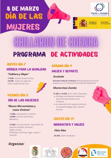 Con motivo del día 8 de Marzo, Día Internacional de la Mujer, el Ayuntamiento de Chillaron ha organizado un programa de actividades durante los días Jueves 7, Viernes 8, Sábado 9 y Jueves 14 de Marzo, teniendo lugar en diferentes ubicaciones del pueblo.