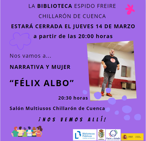 Información de la biblioteca. Félix Albo en el Salón Multiusos de Chillarón de Cuenca el jueves 14 a las 20:30 horas.