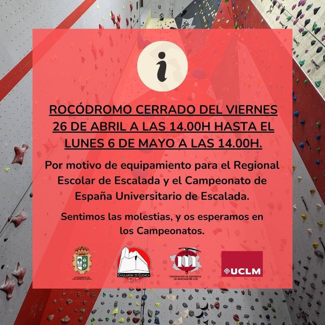 3, 4 y 5 DE MAYO: CAMPEONATO NACIONAL UNIVERSITARIO DE ESCALADA. Una semana después de ser epicentro regional, Chillarón será el epicentro nacional, ya que en las mismas instalaciones que se celebrará el Regional Escolar, tendrá lugar el Campeonato Nacional Universitario.