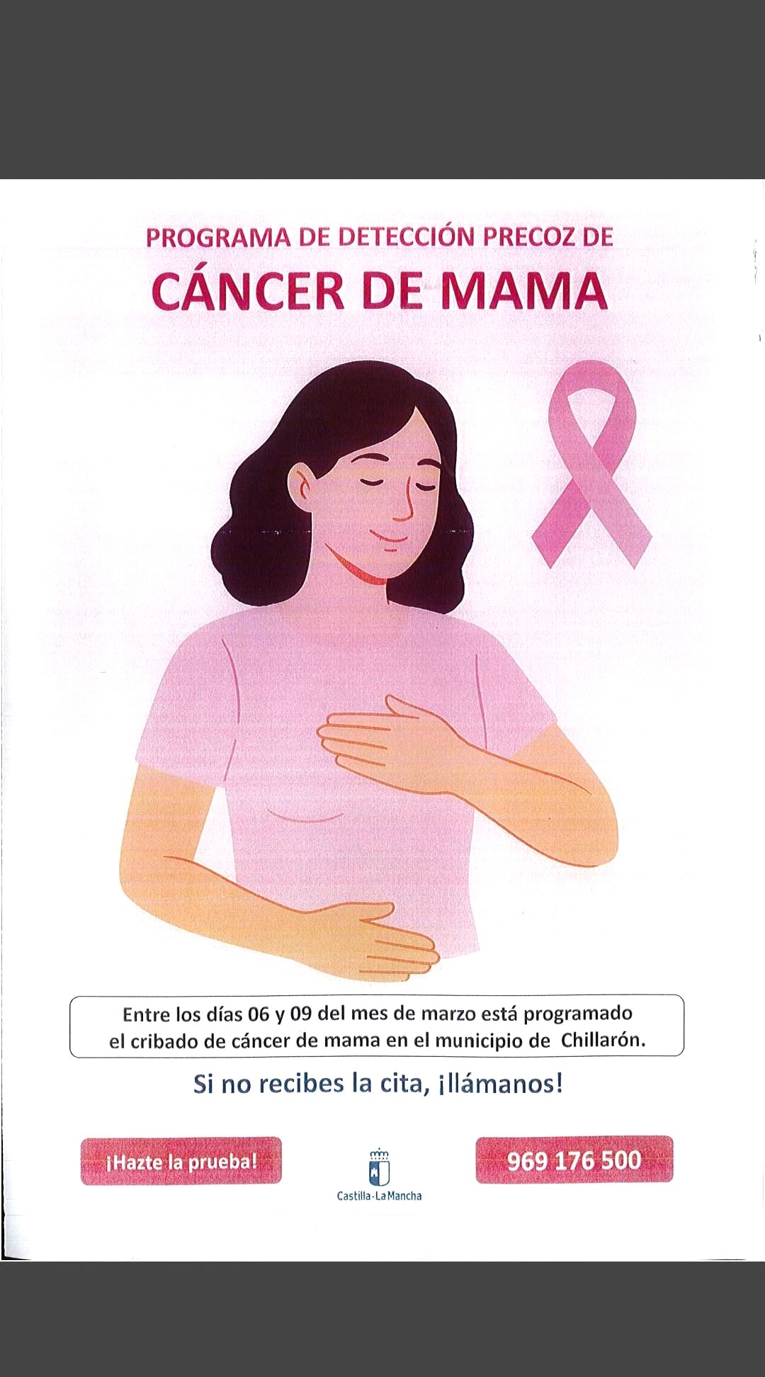 Entre los días 6 y 9 de marzo está programado el cribado de cáncer de mama en el municipio de Chillarón de Cuenca. Sino recibes la cita llama.