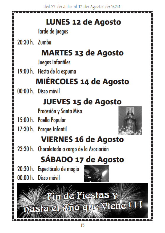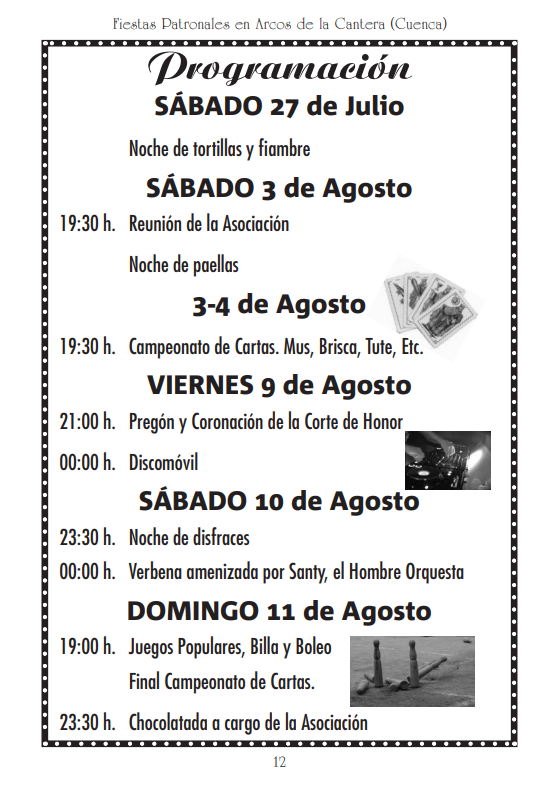 Toda una serie de propuestas muy diversas con juegos refrescantes para unos días muy calurosos: toro de fuego, fuegos artificiales, campeonatos de cartas, concursos de baile y música a cargo de la charanga Aterciopelado, Banda de Cornetas y Tambores de Cuenca y la banda música MUSIGRAMA. DJ Mariu, Grupo Bazter, La Orquesta SHADOW, hombre orquesta JAVI Y SUS TECLADOS, chocolatada, comidas, cenas… donde compartir y retomar relaciones… Donde la participación fue completa y donde disfrutaron tanto niños, jóvenes como adultos.