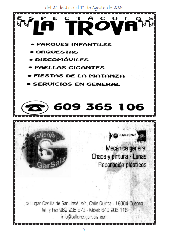 Toda una serie de propuestas muy diversas con juegos refrescantes para unos días muy calurosos, toro de fuego, fuegos artificiales, campeonatos de cartas, concursos de baile y música a cargo de la charanga Aterciopelado y la Banda de Cornetas y Tambores de Cuenca, Grupo Torcas, DJ Pakito, Grupo Bazter, y el Sector Zero, chocolatada, comidas, cenas donde compartir y retomar relaciones… Donde la participación fue completa y donde disfrutaron tanto niños, jóvenes como adultos.