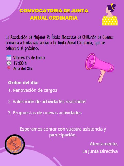 La Asociación de Mujeres «Pa Ídolo Nosotras» de Chillarón de Cuenca, convoca, a todas las vecinas a la Junta Anual Ordinaria, que se celebrará el próximo viernes 23 de enero a las 17:00 horas en el aula del silo.